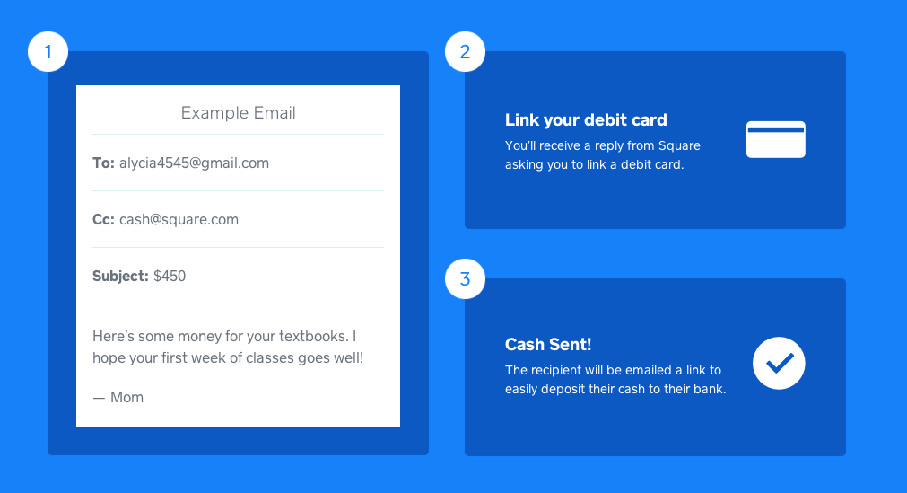 Пишешь человеку электронное письмо, ставишь в копию cash@square.com, в теме указываешь сумму. Первый раз тут же в ответ приходит письмо с просьбой указать номер карты. Так же и получателю. Всё! Никакой комиссии, никаких интерфейсов и всего такого.